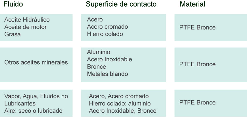 Las Guías de Vástago o Pistón de PTFE con cargas, asegura un recorrido preciso y suave de las partes deslizantes preservando el contacto del metal-metal.